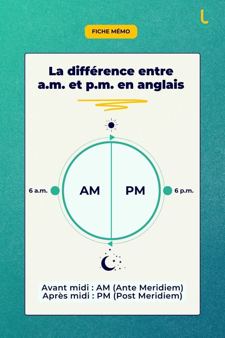 En anglais, pour indiquer l'heure, on utilise les termes AM (Ante Meridiem) et PM (Post Meridiem). Ces abréviations permettent de spécifier si une heure appartient à la période avant midi (AM) ou après midi (PM). Cette règle est importante car elle est utilisée dans les contextes quotidiens tels que les horaires de transport, les rendez-vous professionnels, les événements ou encore les horaires de travail. Savoir quand utiliser AM et PM vous permettra de comprendre les horaires exprimés en anglais et d’éviter toute confusion, notamment entre minuit et midi.