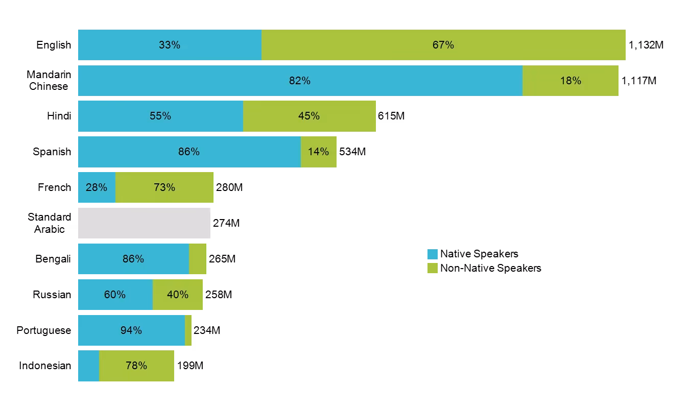 Notably, Arabic and French also have significant shares of non-native speakers. Conversely, languages like Bengali and Portuguese show much lower percentages of non-native speakers, indicating more localized use.