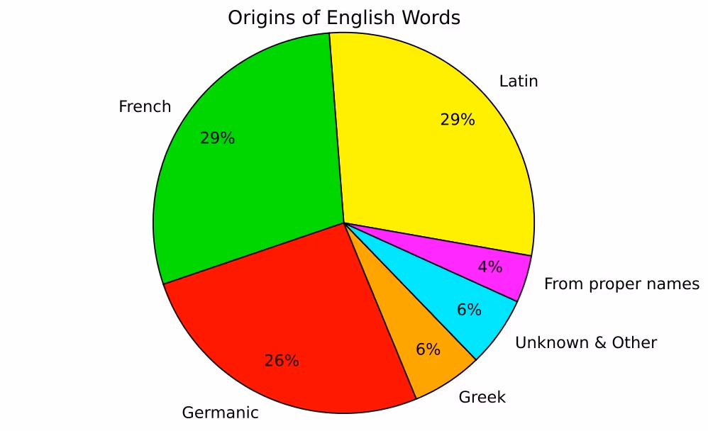 - The largest portion of English words—29%—comes from Latin (via French), reflecting the significant influence of Norman French after the Norman Conquest in 1066.
