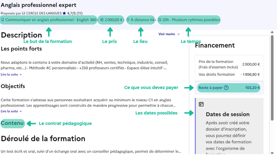 C'est votre contrat pédagogique, il contient toutes les informations essentielles, de la durée de la formation à la certification que vous allez passer à la fin. Vous pouvez aussi consulter les avis des précédents apprenants pour juger de la qualité de l’offre pédagogique. Et bien sûr comparer le prix total à votre solde CPF pour savoir quel est le montant du reste à charge.