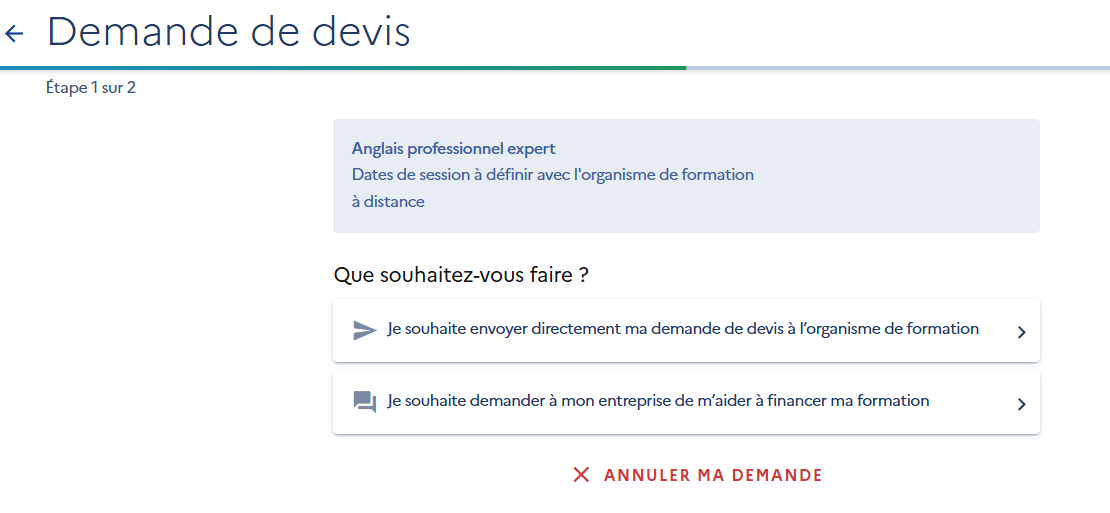 Vous pouvez directement cliquer sur "Je souhaite envoyer directement ma demande de devis à l'organisme de formation".
