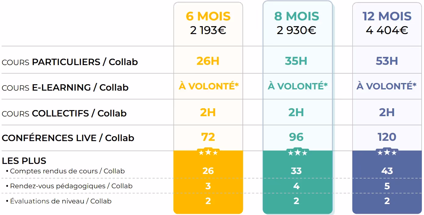 Ces cours collaboratifs, animés par nos professeurs, sont limités à 4-7 élèves, répartis par niveaux pour favoriser l’échange.